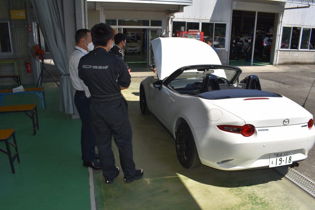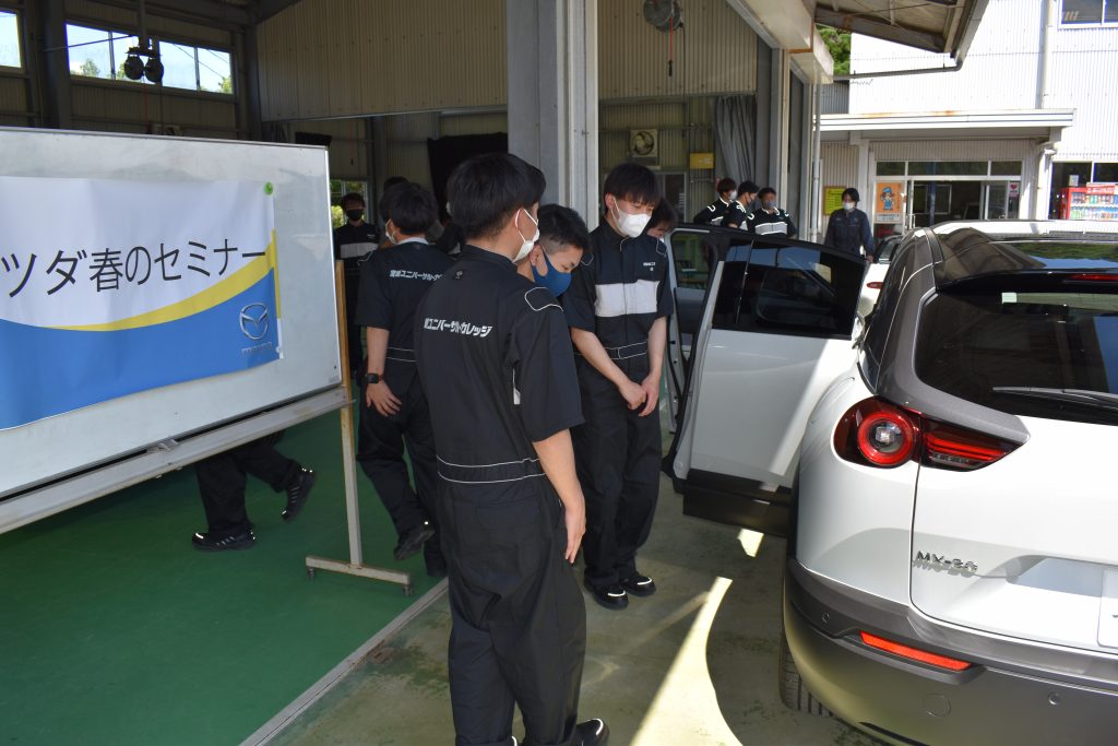 座学講習ではマツダの新世代技術である、SKYACTIVE-G(スカイアクティブG)についてご説明いただき、実習場では、故障診断と点検作業のデモンストレーション及び本校卒業生による講話、更にはCX-5、MX-30、ROADSTER(ロードスター)の車両3台を持ってきていただき見取りなど実施していただきました。自動車整備士の卵となる学生にとって大変勉強になるセミナーでした。