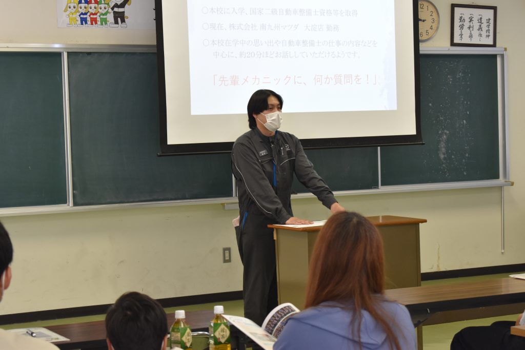 今回の卒業生講話は、株式会社南九州マツダに勤務している神代朋季さんに