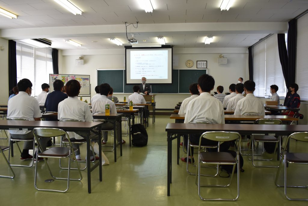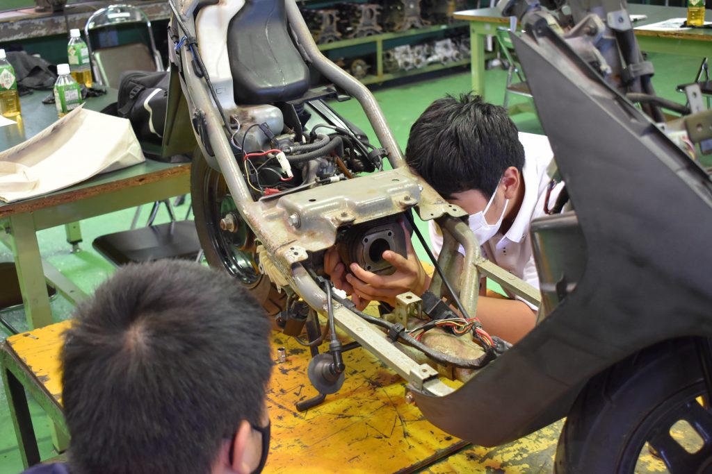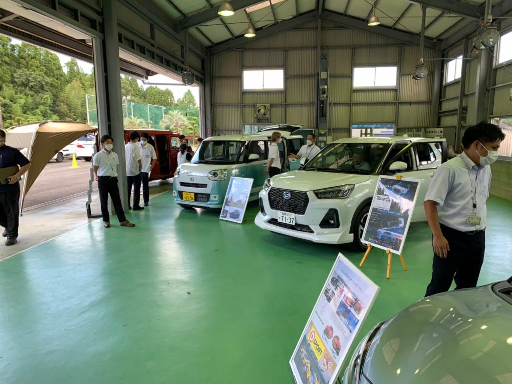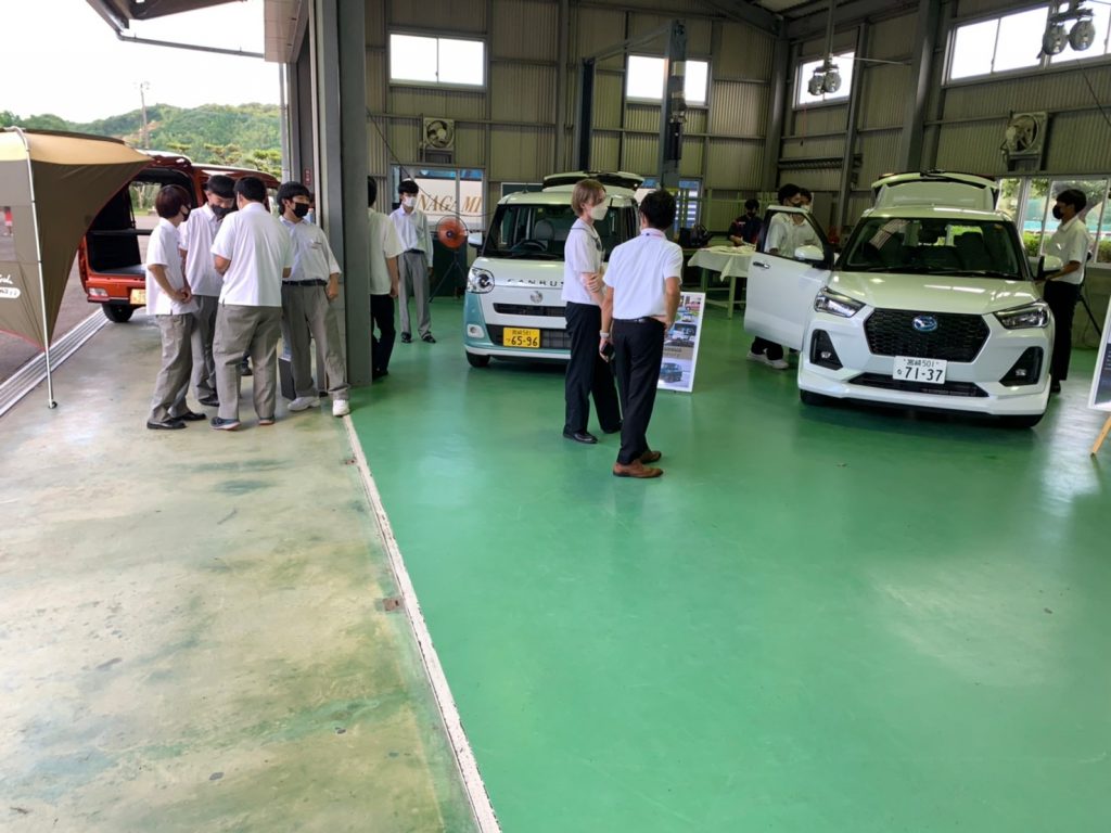 今回の卒業生講話は、宮崎ダイハツ販売株式会社に勤務している河埜海斗さんにご協力をいただき『 在学中の思い出 』や『 現在の業務内容 』などの講話を実施していただきました。更には、宮崎ダイハツ販売株式会社 様のご厚意で『COPEN GR SPORT』をはじめ『Rocky(ロッキー)』『CANBUS(キャンバス)』そして『新型アトレーキャンピングカー仕様』の4台をご準備していただき、実習場で特別体験授業や同乗試乗体験を実施していただきました。