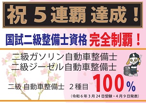 令和5年度(令和6年3月)卒業生 35名 が 国家二級自動車整備士 2種目 全員合格を達成いたしました!!! ( 令和6年3月24日(日)受験 ・ 令和6年4月9日(火)発表 )