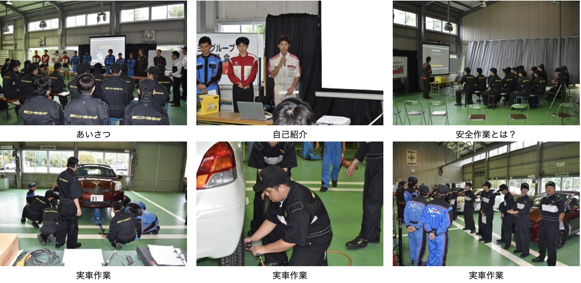 セミナーでは、自動車整備の基本となるジャッキアップ作業を基に、今後、自動車整備士となる学生に実習を通じて